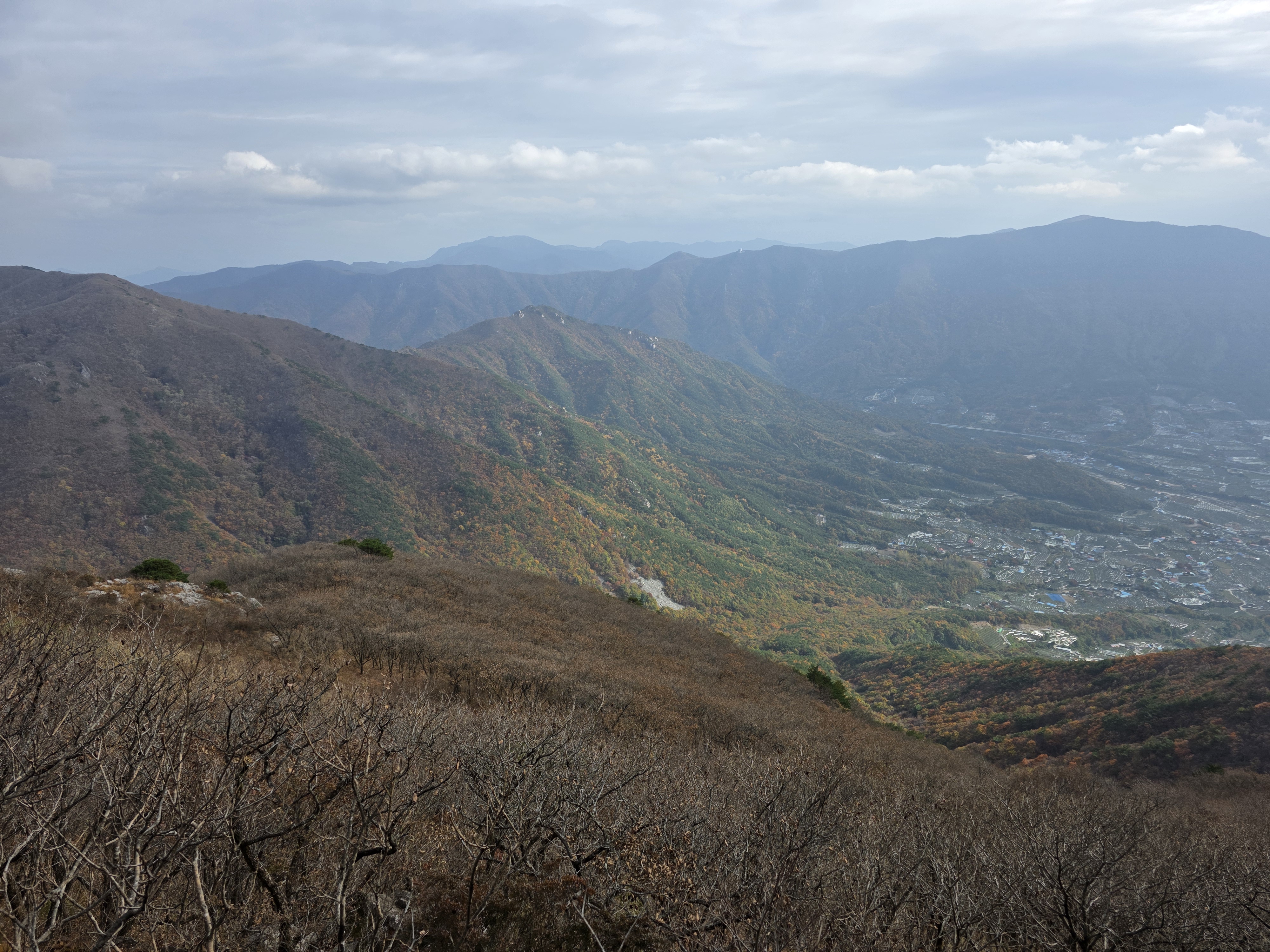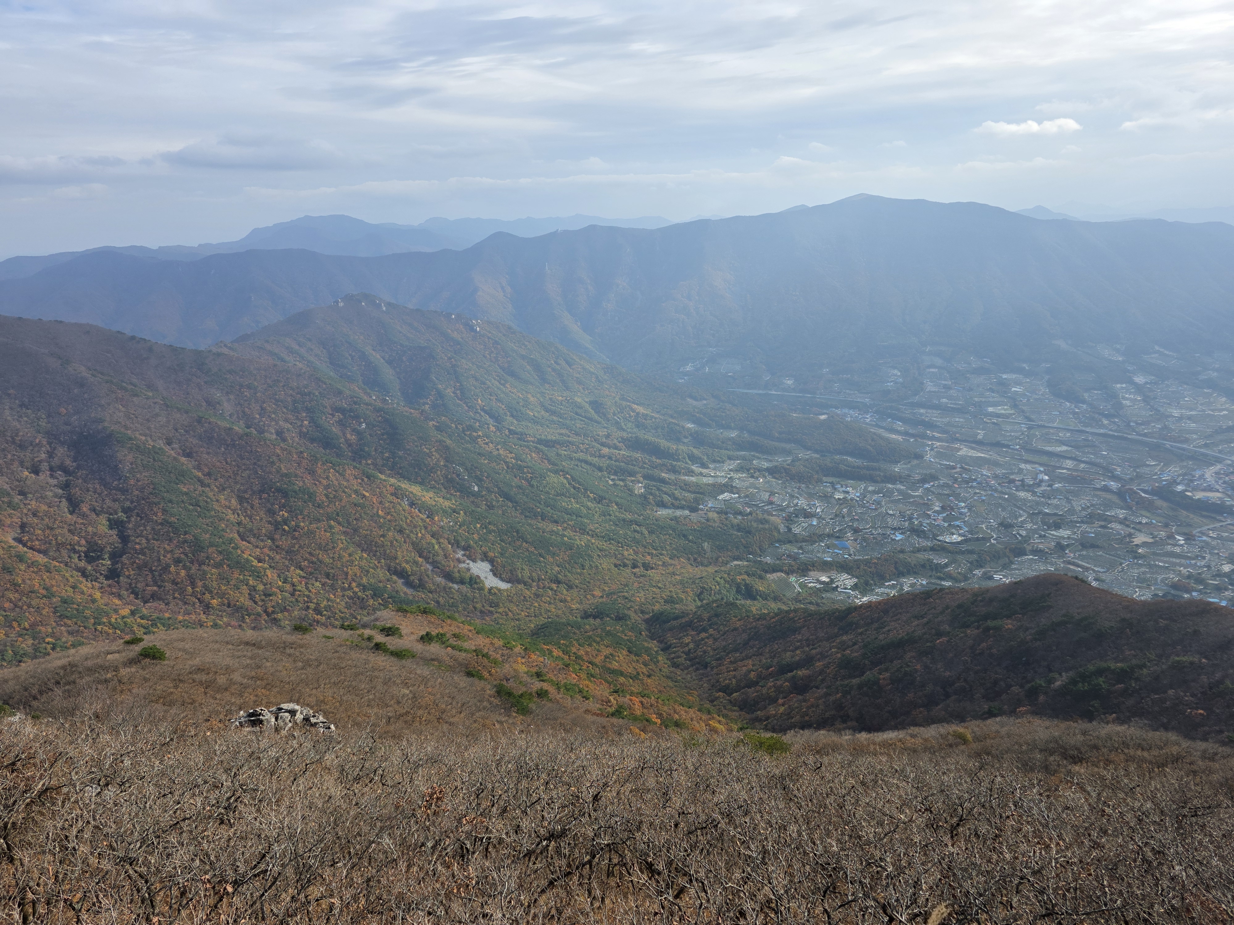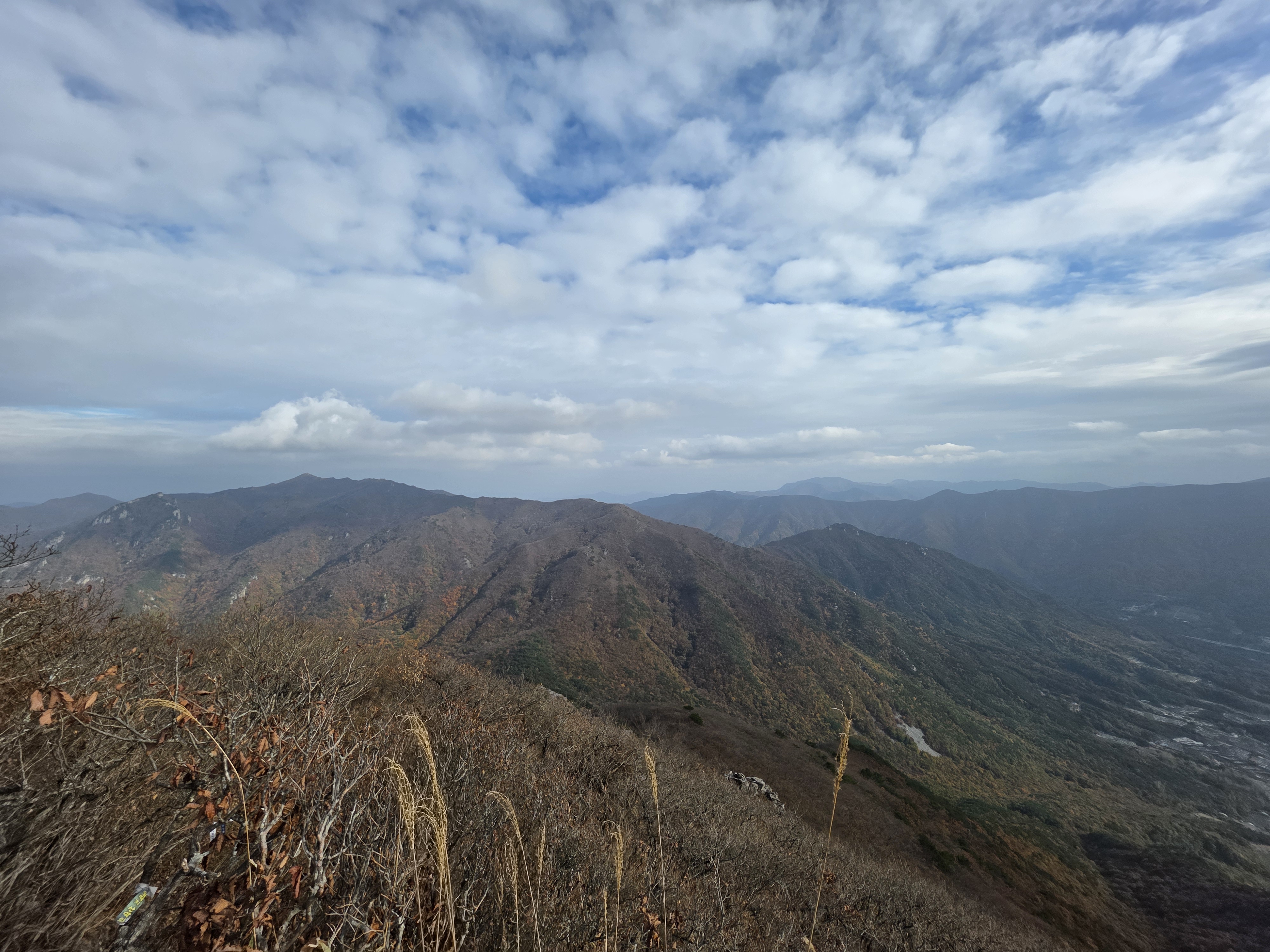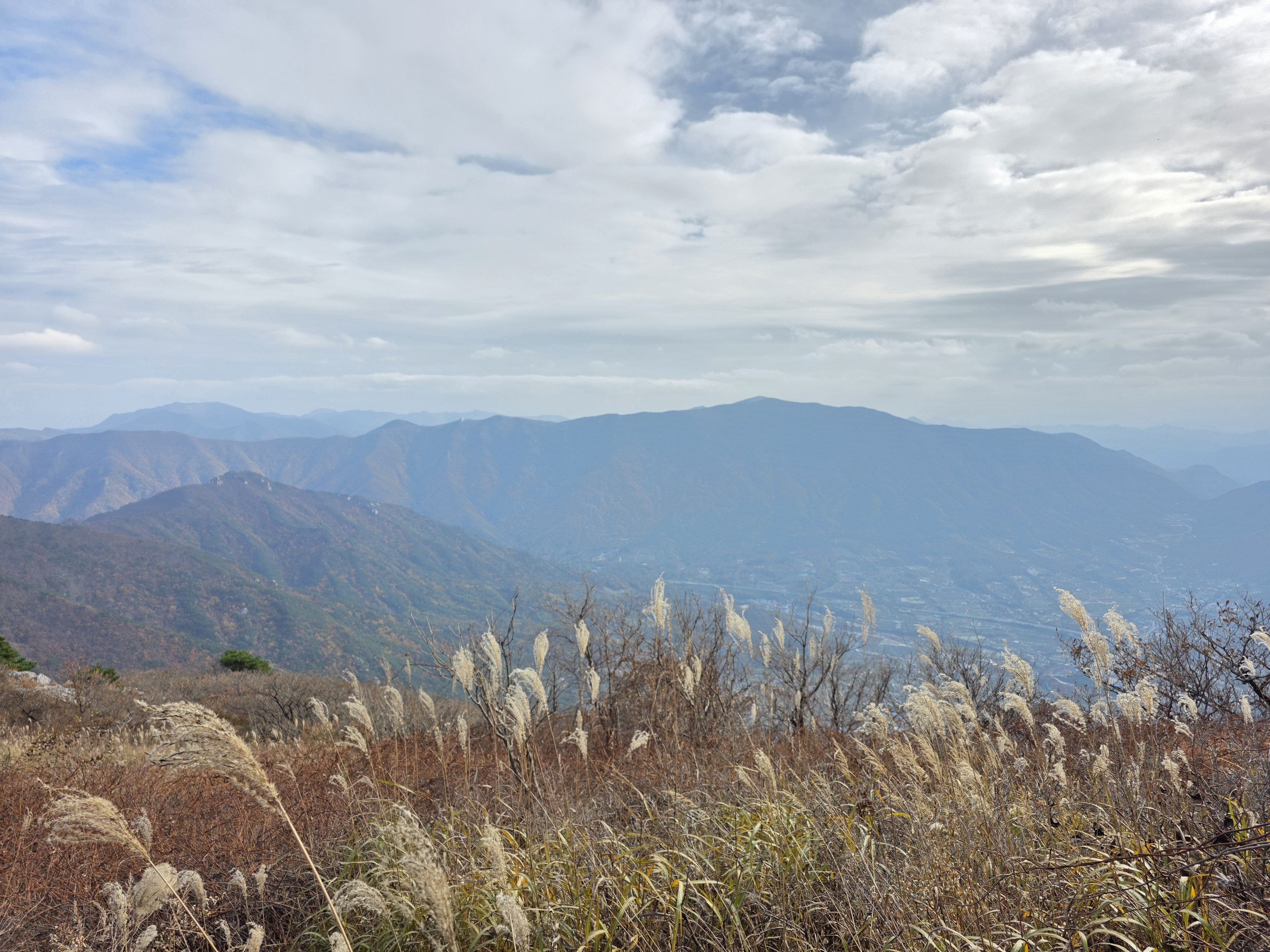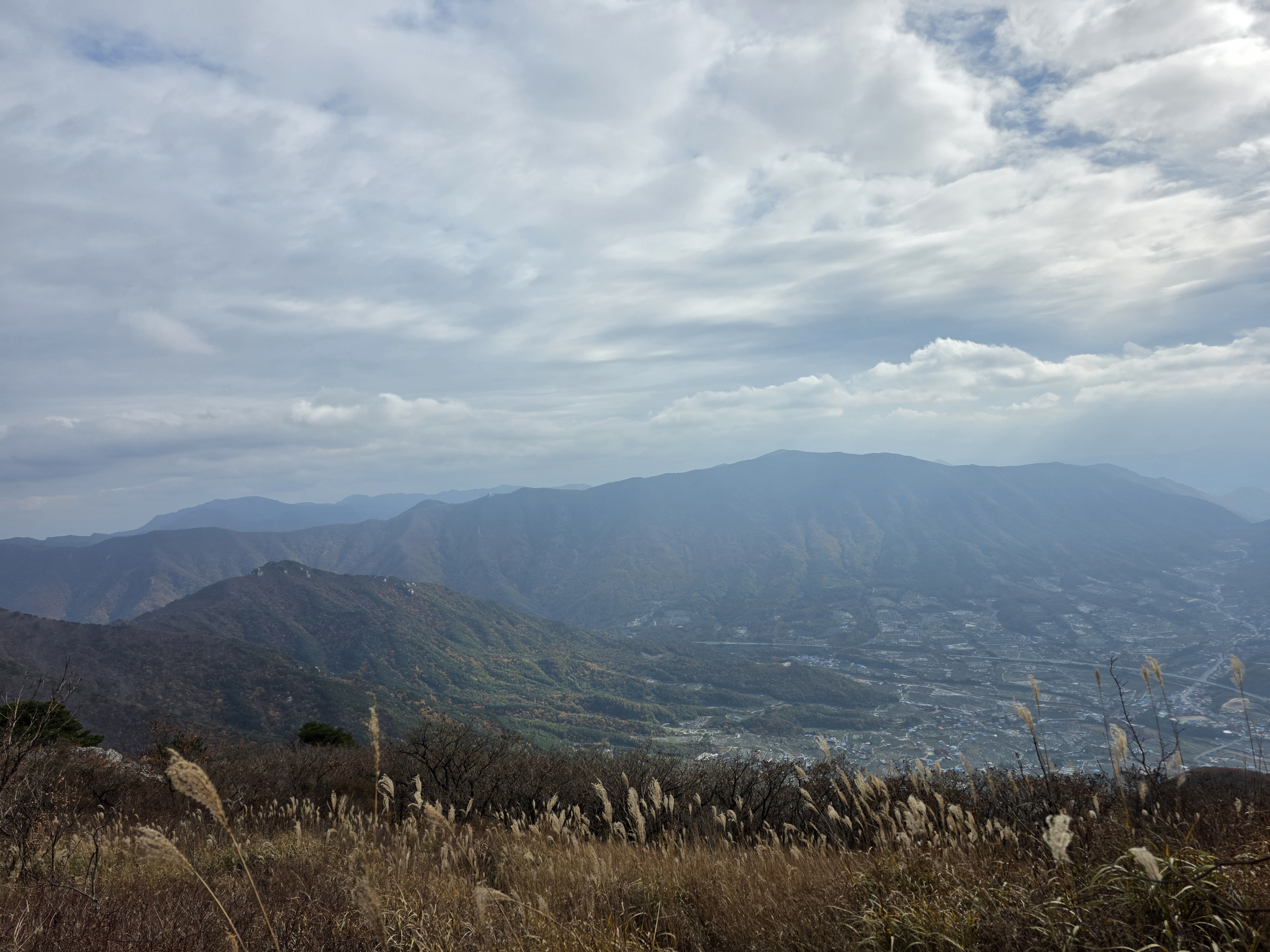 구름이 물러가 억새 넘어 낙동정맥과 영남 마을을 한눈에 담으니 피로 싹~ 가심