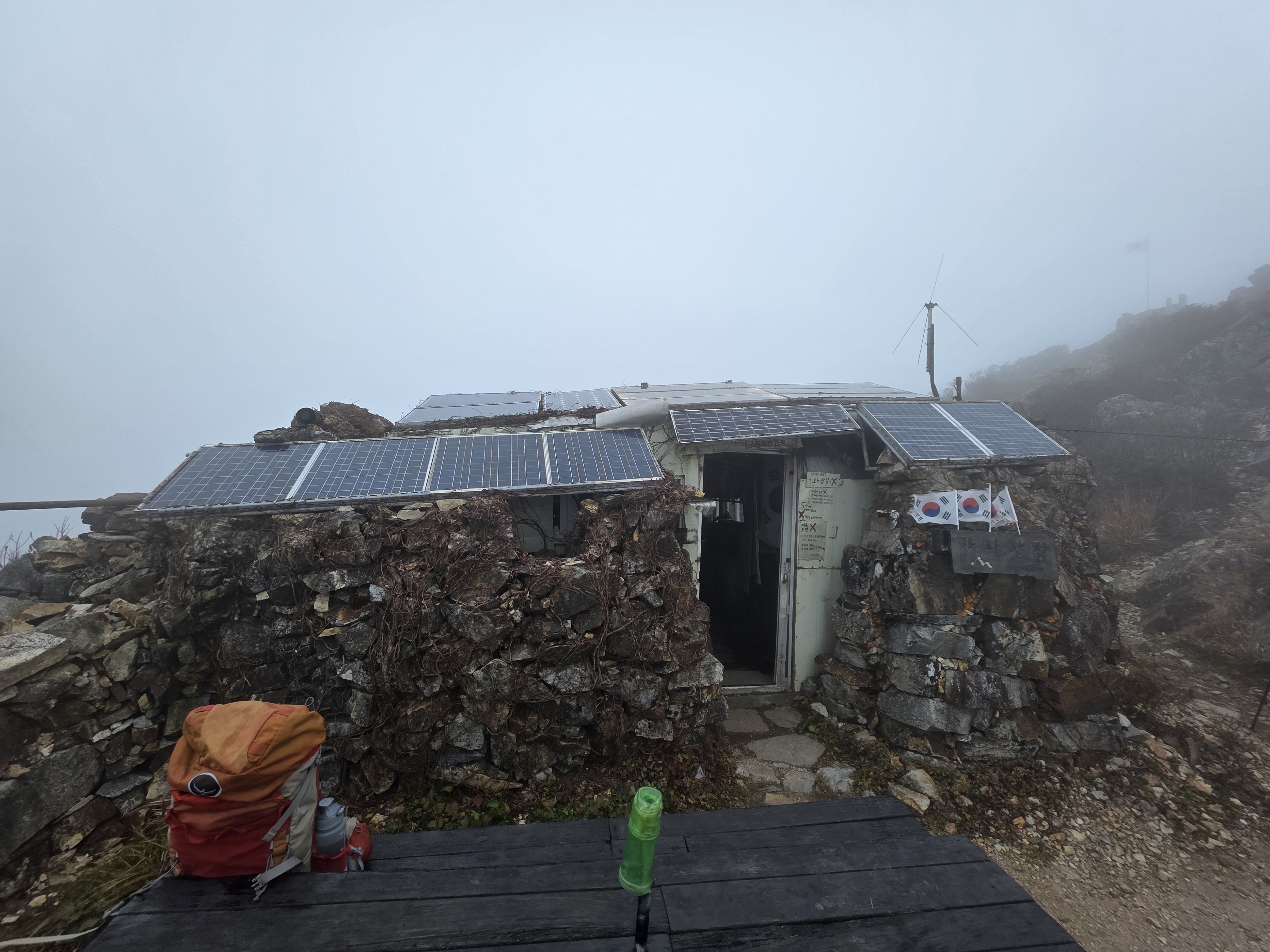 구름 때문에 포기한 풍경이지만, 사진 찍다 폰이라도 떨어뜨릴라 세차게 몰아치는 바람을 피해 봉우리 아래 산장으로 내려선다.