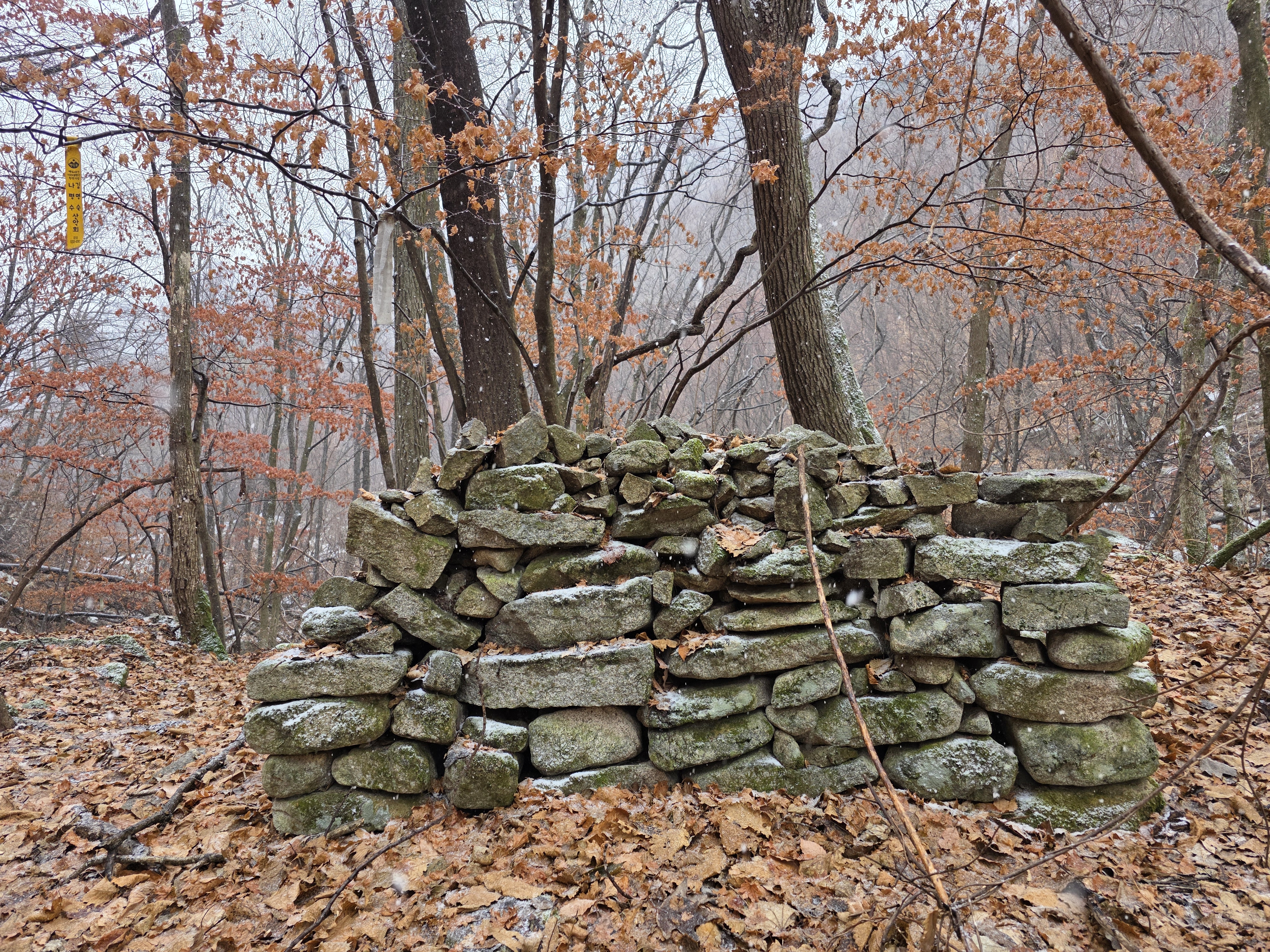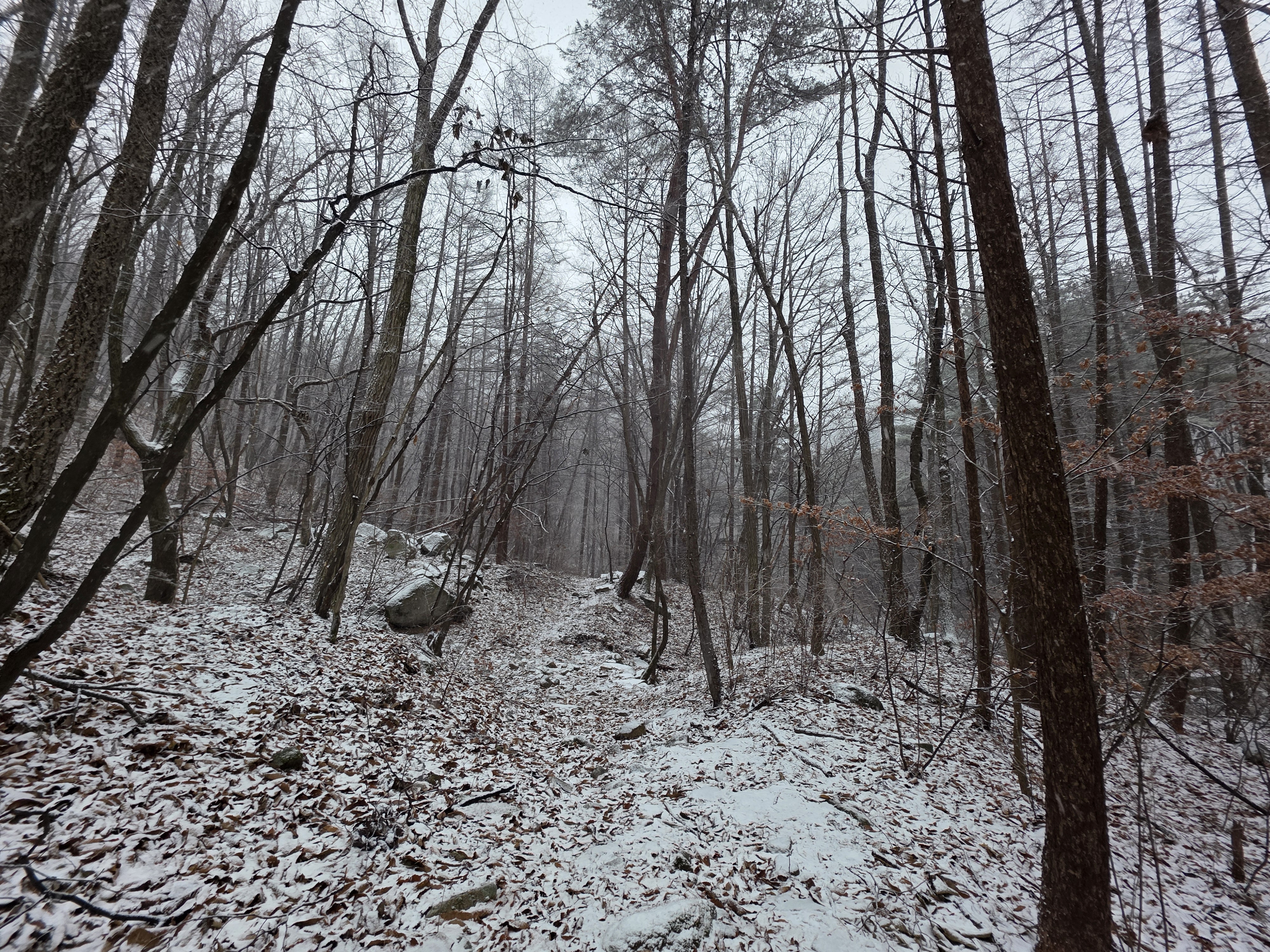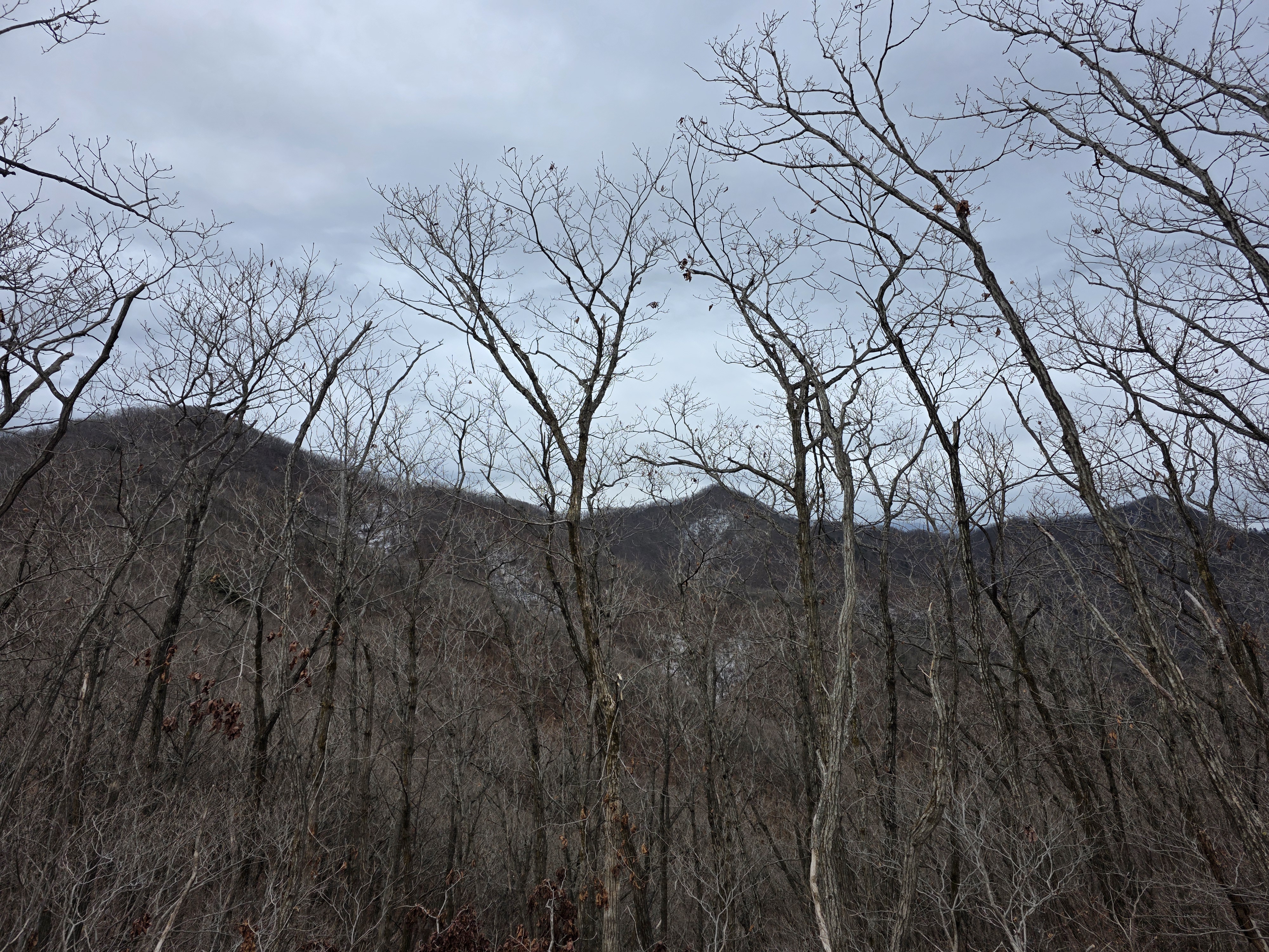 시작된 눈 때문에 시야가 가려진 것도 있지만, 100대 명산 치고 능선 자체가 동네 뒷산 같다는 느낌이다.