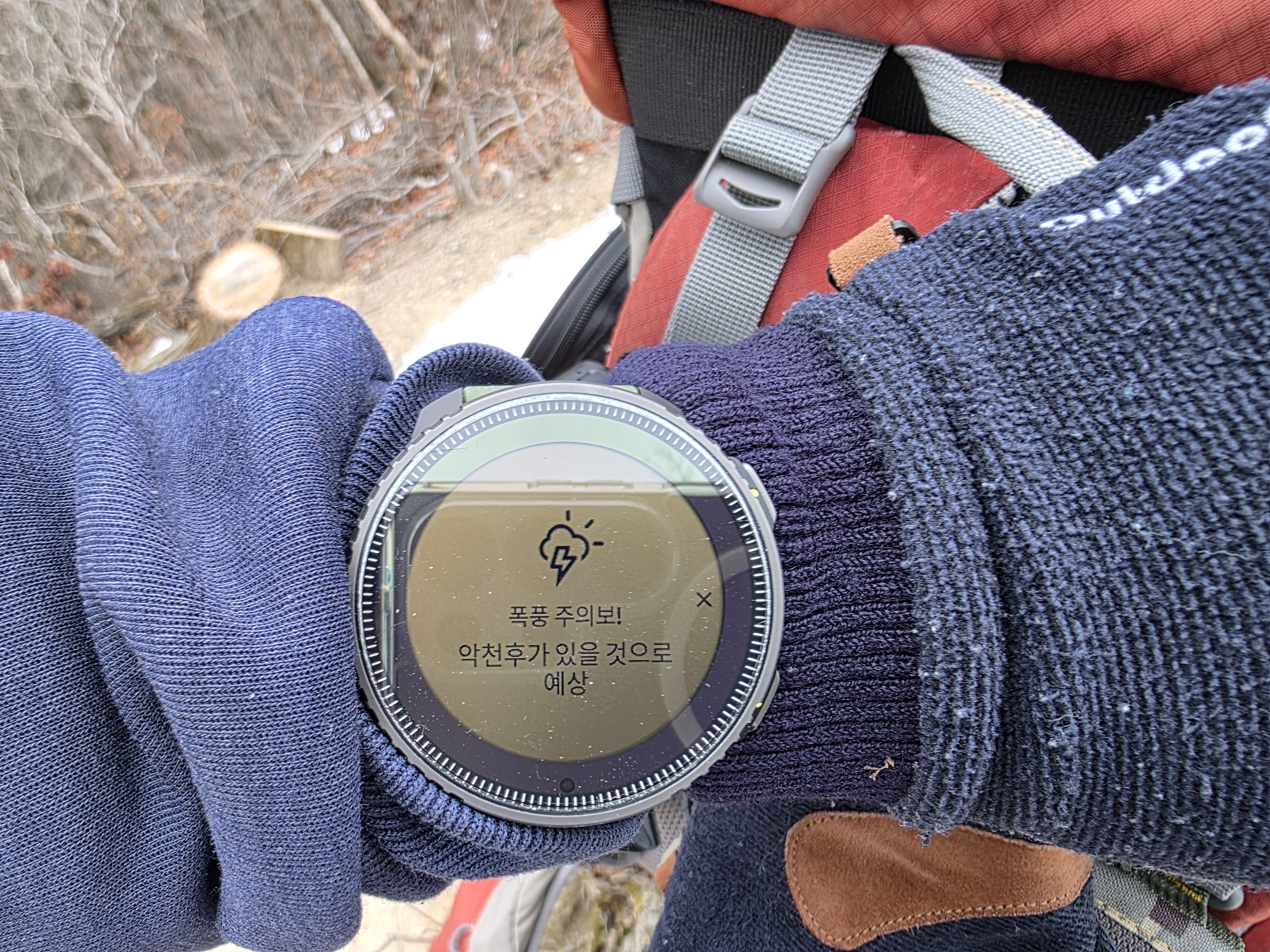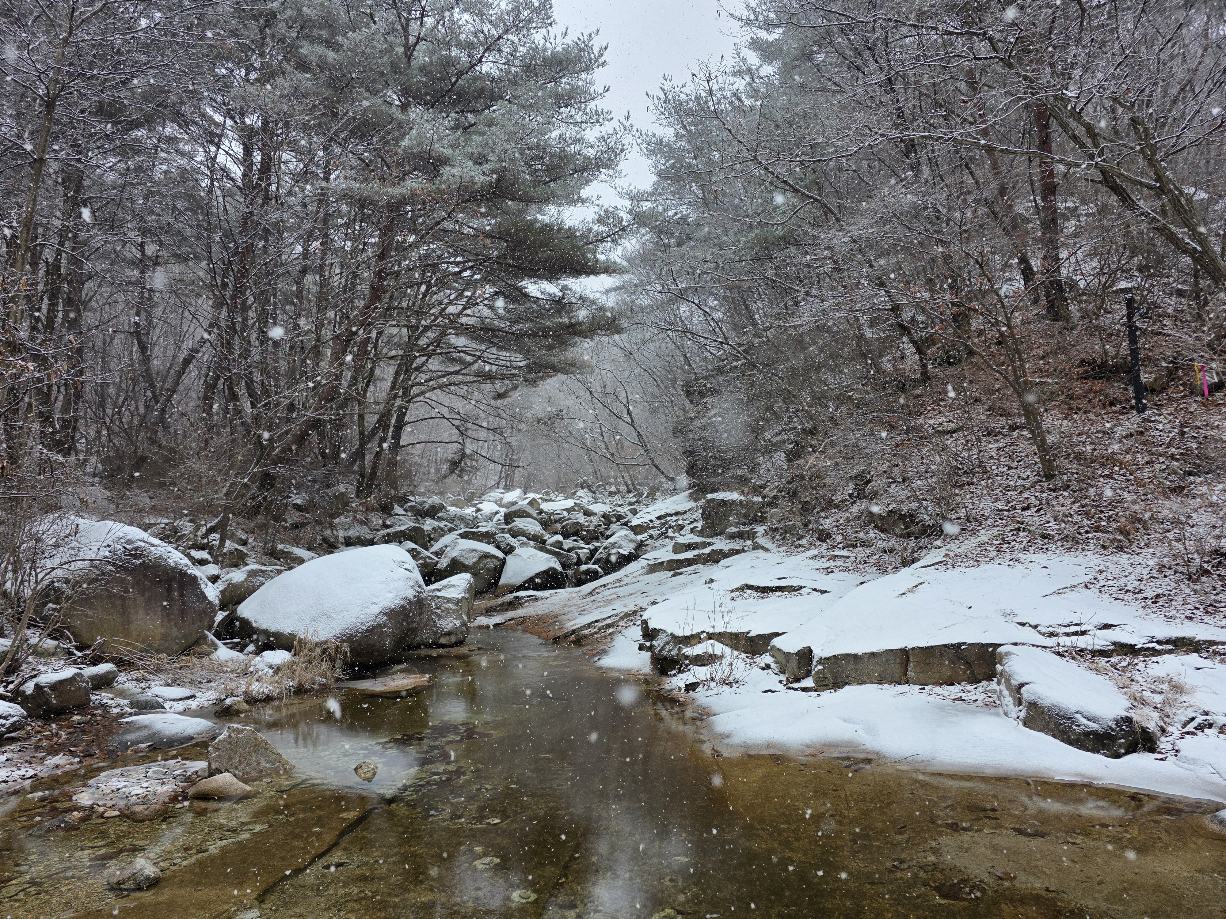 향로봉-흥룡봉을 갈까말까 서너번 움직거리다 발길을 돌린다. 눈 때문에 일정이 어찌될지 모른다는 생각이 우선한다. 아~ 어제부터 이어지는 가파른 계곡길 ㅠㅠ. 그래도 빨간 비닐 끈이 길을 확인해 준다.