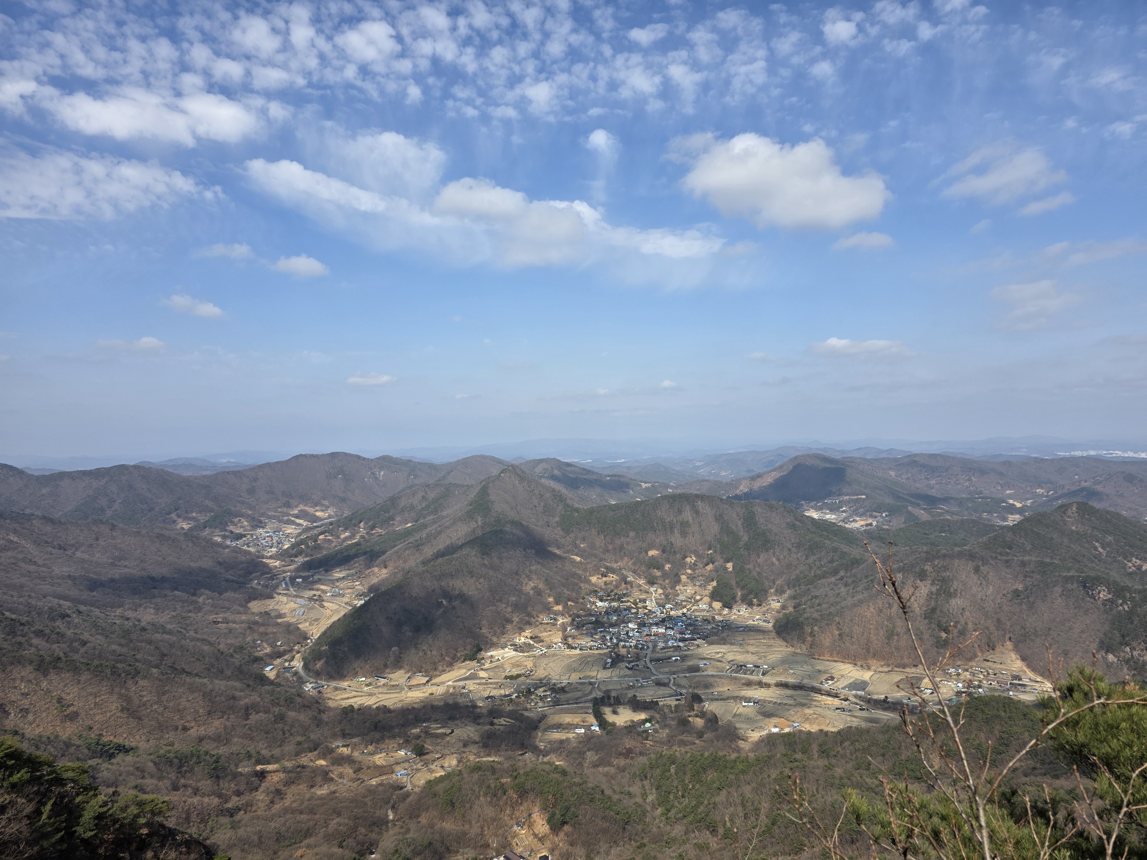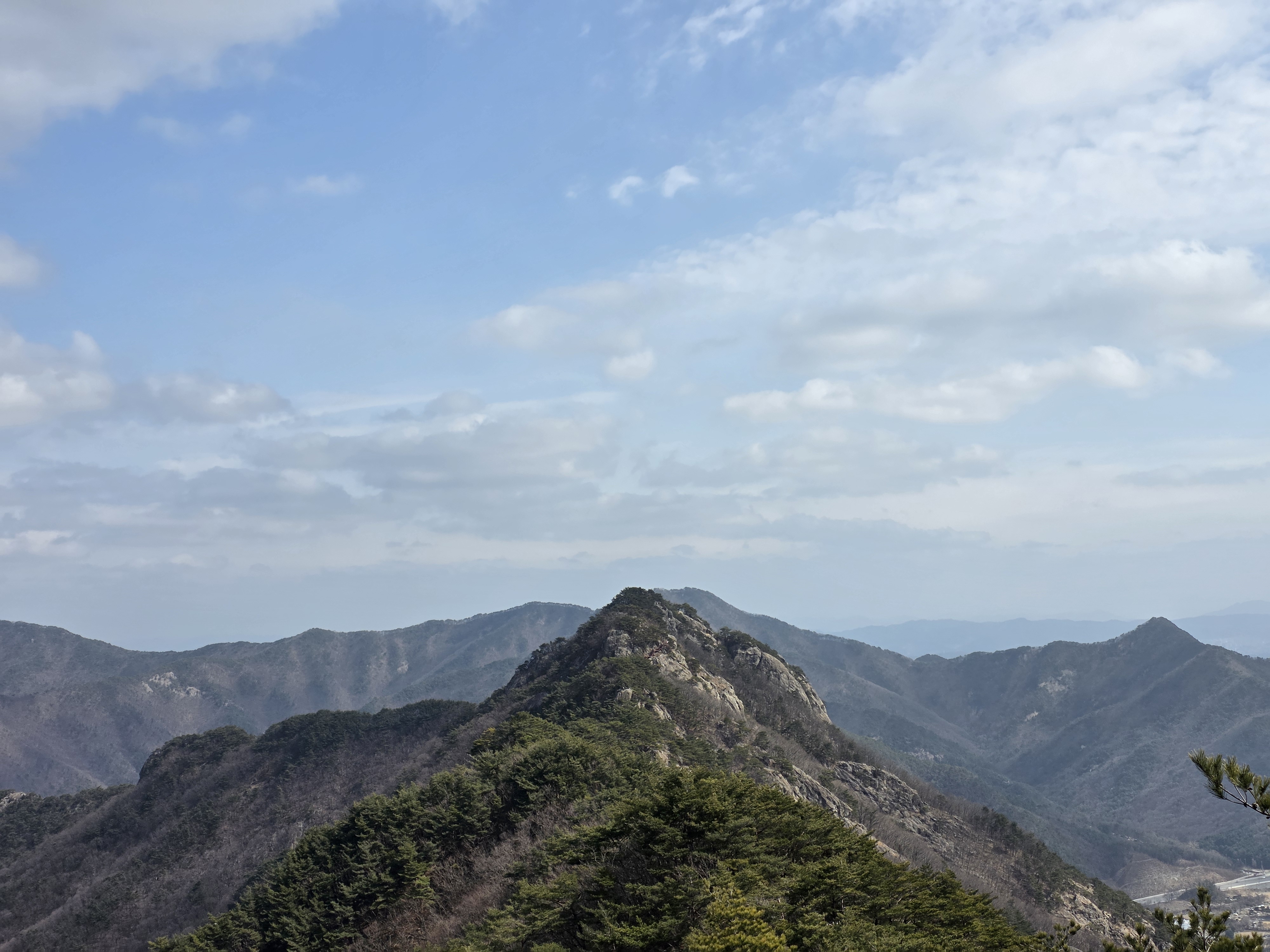 동쪽으론 코 앞 박정자 삼거리와 삽재, 서쪽으로는 세종시 빽빽한 아파트 단지도 눈에 들어온다. 여기선 능선을 따라 올라온 그 늠름한 봉우리가 차분하게 보인다.